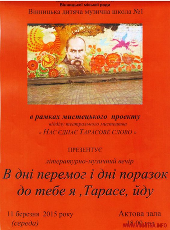 11 березня у Вінниці в рамках Мистецького проекту « Нас єднає Тарасове слово» та проекту «Творимо разом» відбудеться літературно-музичний вечір «В дні перемог і дні поразок до тебе я, Тарасе, йду».