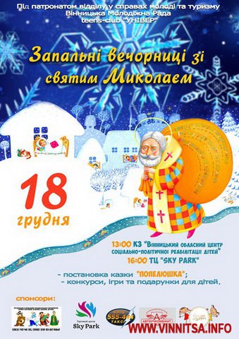 18 грудня вінничан запрошують на запальні вечорниці зі Святим Миколаєм. О 16.00 на Європейській площі (біля літньої площадки піцерії «Челентано», ТЦ «Sky Park») всі бажаючі зможуть переглянути постановку казки «Попелюшка», а також взяти участь у конкурсах та іграх та скуштувати смачний узвар.