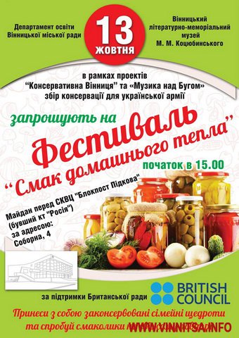 «13 жовтня у Вінниці відбудеться фестиваль «Смак домашнього тепла». Це вже третій захід такого типу. Ми тут будемо збирати консервацію для воїнів, які зараз в зоні АТО.