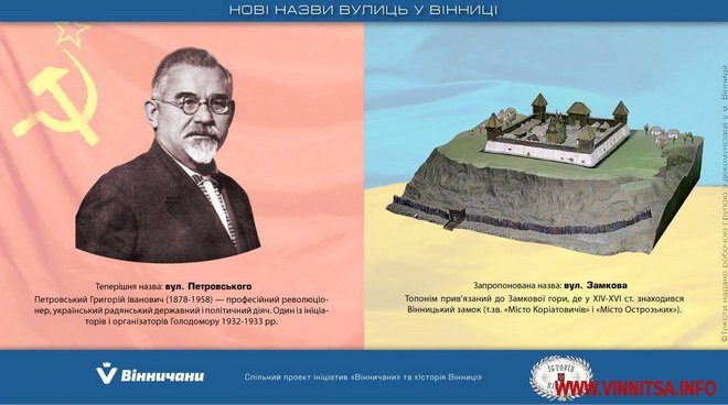 Так, вулицю Петровського пропонують назвати Замковою через Замкові гору, де у XIV-XVI ст. знаходився Вінницький замок.