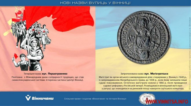 Вулицю Першотравневу, що проходить історичним центром Вінниці, планують перейменувати на Магістратську. Магістрат як орган місцевого самоврядування діяв з перервами у Вінниці з 1640 року. Розміщувався у ратуші, що знаходився на ринковій площі.