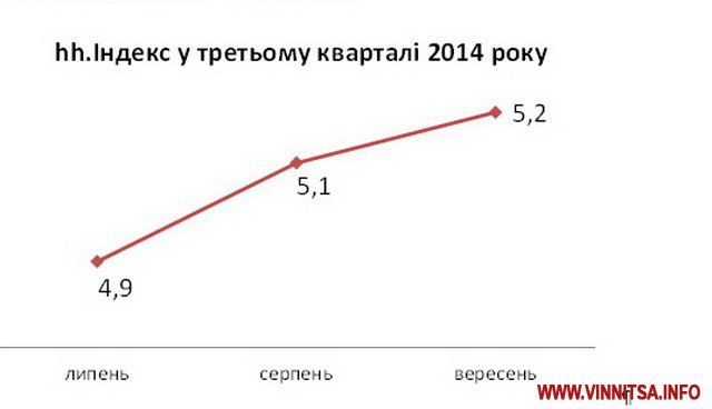 У зв’язку з тим, що кількість вакансій не збільшується, а нових резюме все стає більше, зростає і конкуренція на ринку праці. Так, hh.Індекс (відношення кількості резюме до кількості вакансій) у першому і другому кварталі складав 4,2 — 4,5 (чотири пошукачі на одну вакансію), а в третьому — вже 5 (п’ять пошукачів на одну вакансію).