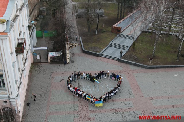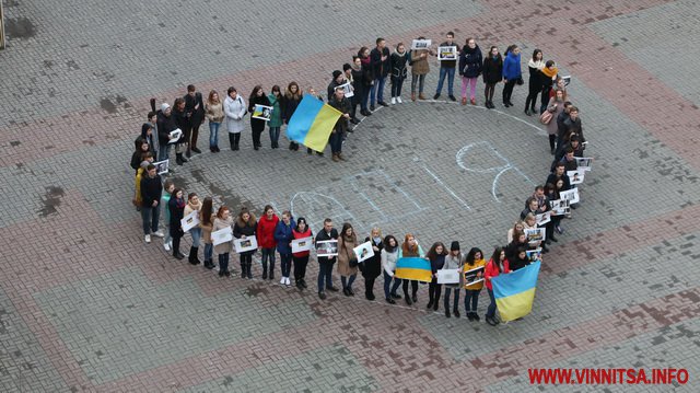 Близько сотні студентів з різних навчальних закладів Вінниці на площі стали у формі серця. В середині писали «Надія». І усі разом заспівали гімн України.