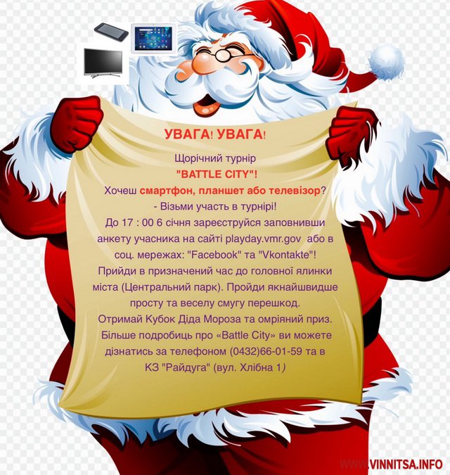 На новорічні свята у Вінниці відбудеться турнір «Battle City» за кубок Діда Мороза. Вже розпочалася реєстрація учасників. Самі змагання проходитимуть у три етапи. Переможців назвуть на закритті вінницької ялинки 17 січня. Вони отримають телефон, планшет та телевізор.
