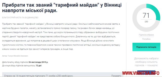 «Прибрати так званий «тарифний майдан» у Вінниці навпроти міської ради. Оскільки наближаються зимові свята, а картина брудних палаток, намету, встановленого прямо посеред газону, та іржавих бочок зведе нанівець усі старання створити новорічний настрій. Тим паче, що окрім поганенького піару ображених виборцями політичних партій, даний «тарифний майдан» не представляє собою більше нічого. Дивлячись на те, що там відбувається, складається враження, що потрапив в дешевий цирк з поганими клоунами. Якщо Вінниця дійсно хоче стати туристичним містом, то повинна боротися з саме такими проявами політичної агітації, оскільки в даному випадку ніяким чином не йдеться про захист інтересів громадян, а лише піар», - йдеться у петиції.