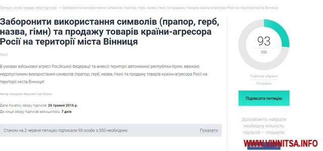 На сайті місцевих петицій зареєстрували звернення до Вінницької міської ради, в якому просять заборонити використання символів та продаж товарів з Росії на території м. Вінниці.