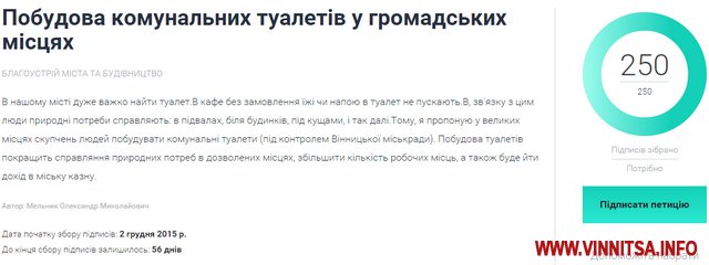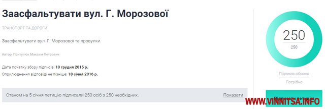 5 січня на сайті петицій до Вінницької міської ради одразу два електронних звернення набрали необхідну кількість голосів – по 250.