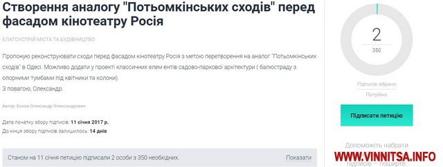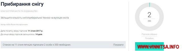 За пів дня 11 січня на сайті місцевих петицій, до Вінницької мерії зареєстрували 8 електронних звернень. Петиції на різноманітну тематику, деякі з них є дивними, деякі не зовсім за адресою. Люди пропонують зробити навпроти кінотеатру «Росія» аналог «Потьмкінських сходів», відремонтувати ринок «Урожай», не повертати літак на площу Костянтина Могилка, встановити на всіх видах громадського транспорту GPS, пустити автобус за маршрутом Західний автовокзал - Вінницькі хутори та… не давати вихідних працівникам мерії за неприбраний сніг.