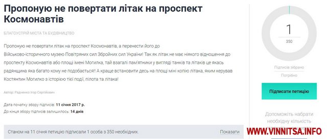 Військово-історичного музею Повітряних сил Збройних сил України! Так як літак не має ніякого відношення до проспекту Космонавтів або площі імені Могилка, тай взагалі пам'ятники у вигляді танків та літаків це якась радянщина яка багато кому не подобається!! А краще встановити десь на площі міні копію літака, яким керував Костянтин Могилко з історією тієї події, пілота та літака!», - вказано в петиції.
