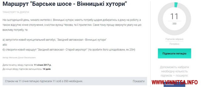 «На сьогоднішній день, чимало жителів с. Вінницькі хутори, мають потребу щодня добиратись з дому на роботу, а також відсутнє нічне сполучення, з містом вулиці Чехова, та її прилеглих. Саме тому прошу звернути увагу на цю важливу потребу, та: