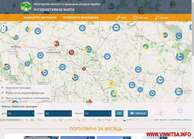 Міністерство екології та природних ресурсів України створило електронний сервіс, за допомогою якого громадяни можуть позначити місця сміттєзвалищ на мапі. Завдяки вінничанам на інтерактивній карті вже зареєстровано 50 таких локацій та 106 місць видалених відходів. За період функціонування мапи в регіоні вже ліквідовано 11 сміттєзвалищ, на черзі - 28.