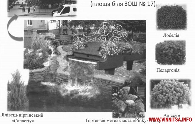 Вінничани пропонують встановити незвичайний фонтан на площі біля «МакДональдза». Композиця складатиметься з водойми і гранітного роялю, по клавішах якого тектиме вода. Музичний інструмент прикрасять квітами.