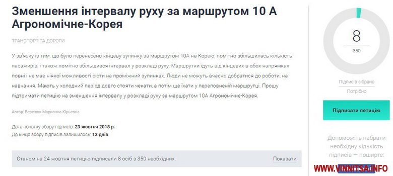 Дата початку збору підписів 23 жовтня, до кінця збору – 13 днів. Щоб петицію розглянули, потрібно 350 підписів, наразі їх 8.