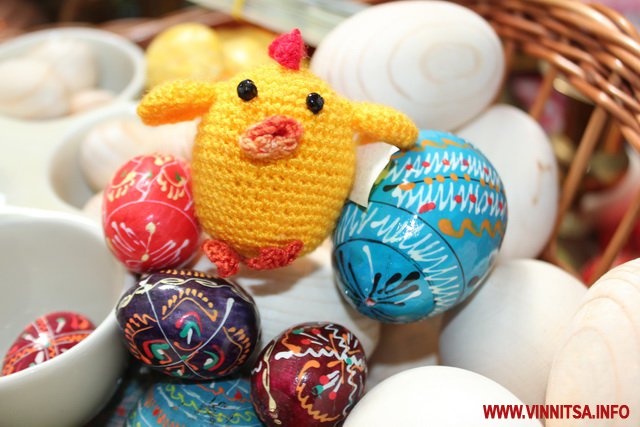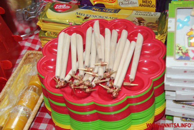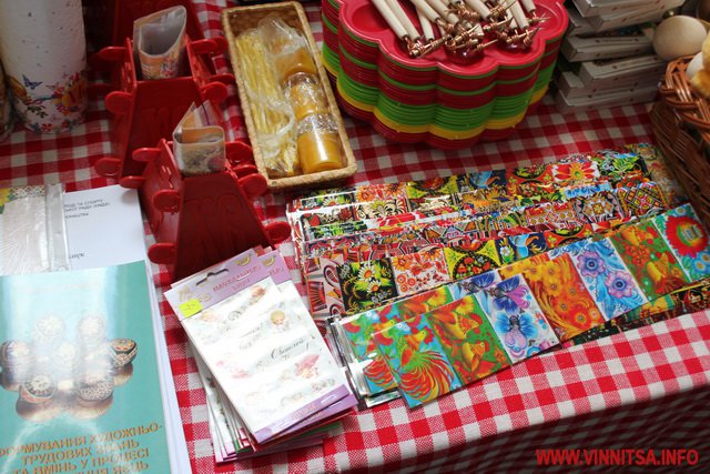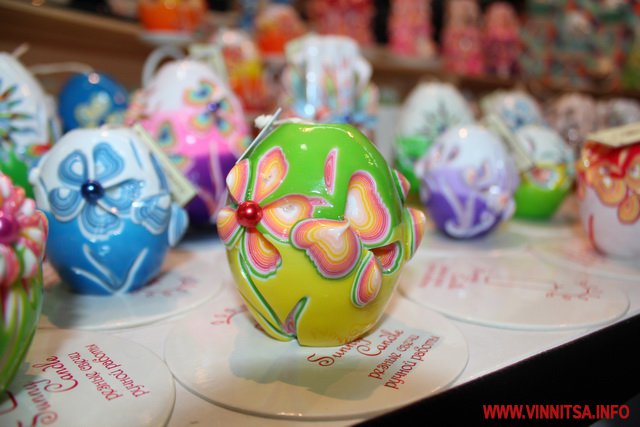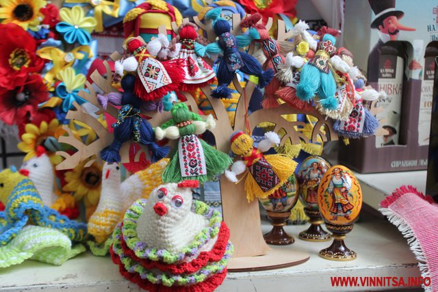 Окрім продуктів, вінничанам пропонують різноманітні святкові сувеніри: ляльки-мотанки, дерев’яні писанки, декоративні свічі, великодні іграшки та вишиванки.