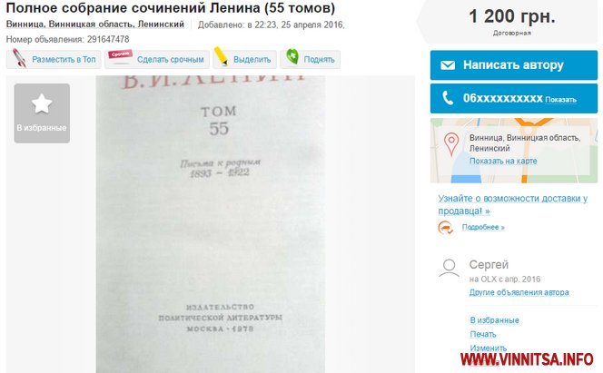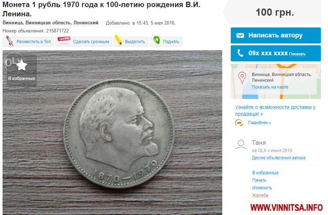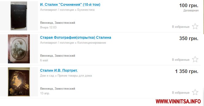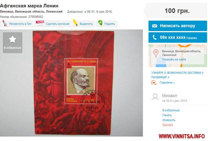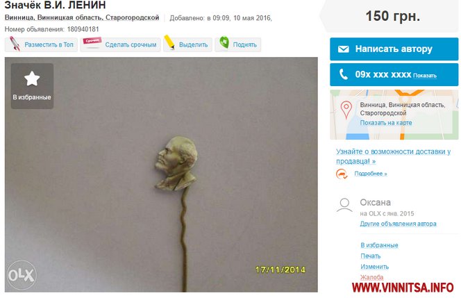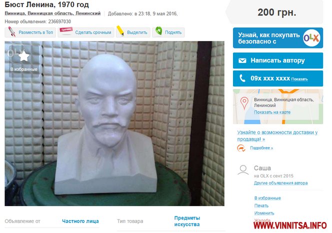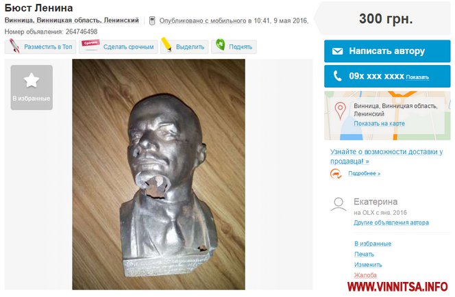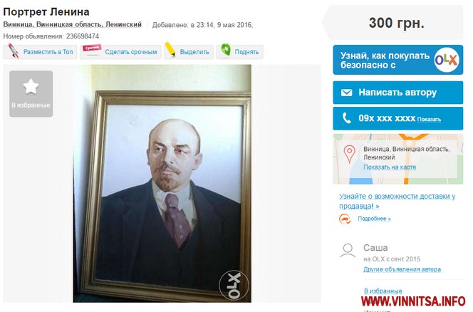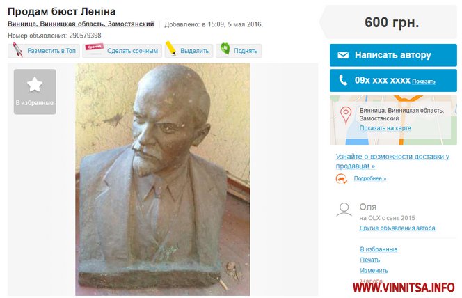 Вінничани почали масово спродувати Іллічів. За останні три дні на сайті оголошень з’явилося близько 10 пропозицій з Леніним. Городяни продають погруддя «вождя», пам’ятні статуетки з його зображенням, монети, марки і картини.