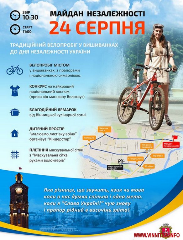 24 серпня у День Незалежності України Вінниця збереться на традиційний велопробіг у вишиванках, з прапорами і національною символікою. Учасниками веселого дійства можуть стати всі охочі.