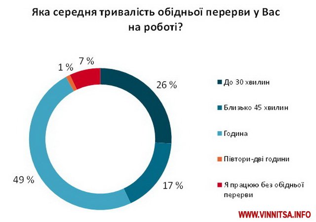 Зазвичай обідня перерва в компаніях триває годину, і половина «білих комірців» використовує її повною мірою. Кожен четвертий офісний співробітник витрачає на обід не більше півгодини, а кожен шостий — близько 45 хвилин. Тільки один зі ста використовує максимальний час, передбачений законодавством, — півтори-дві години. Варто відзначити, що 7% опитаних працюють взагалі без перерви. Найбільше трудоголіків серед топ-менеджерів. Вони частіше, ніж інші, витрачають на обід менше 30 хвилин або не обідають узагалі.
