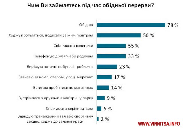 Ті, в кого є бодай трохи часу, намагаються витрати його з максимальною користю. Четверо з п’яти обідають. Кожен другий ходить подихати свіжим повітрям. Третина спілкується з колегами або розмовляє по телефону з рідними. Майже четверта частина опитаних вирішує поточні побутові питання, а кожен шостий просто висить у соц. мережах. 14% встигають пробігтися по магазинах. Кожен десятий зустрічається з друзями у кав’ярні або парку. З керівництвом обідню перерву бажають проводити тільки 5% опитаних. І лише двоє зі ста турбуються про своє здоров’я — відвідують тренажерний зал.