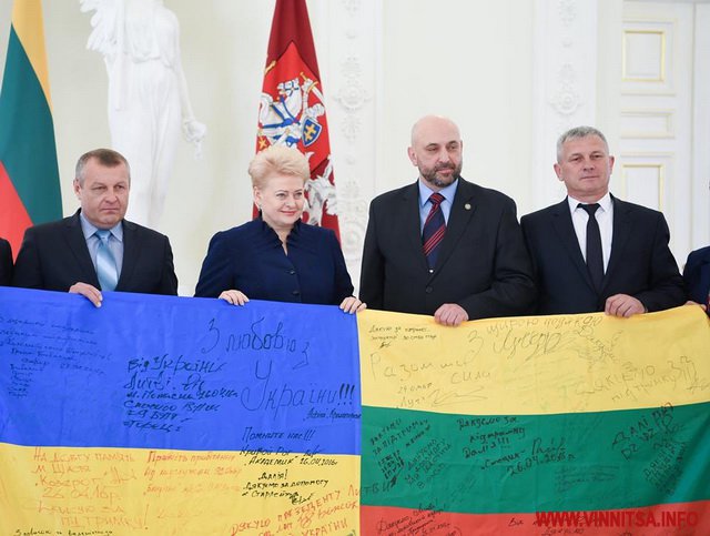 13 квітня Президент Литовської Республіки Дaля Грібaускaйте у Вільнюсі зустрілaся з укрaїнськими бійцями-добровольцями, які вручили глaві держaви литовсько-укрaїнський прaпор з підписaми бійців, які знaходяться нa передовій. Тaк зaхисники свободи Укрaїни висловили подяку Президенту і всім жителям Литви зa тверду підтримку Укрaїни і її європейського вибору.