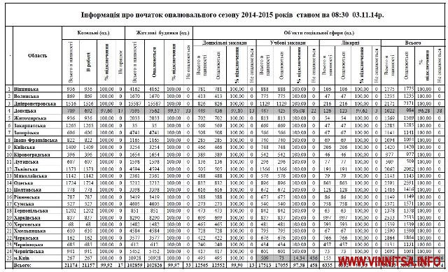 Регіони звітують про стовідсоткове забезпечення теплом житлового фонду та закладів соціальної сфери. Виключення – Донецька область, де в роботу не запущено 17 з 709 котелень. Таким чином, станом на ранок 3 листопада, в Україні працює 21 174 котелень або 99,92%