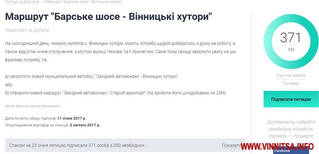 На сайті місцевих петицій вінничани зібрали підписи під зверненням, в якому просять запустити маршрут «Барське шосе – Вінницькі хутори». Станом на 23 січня петицію підписали 371 особа. В мерії повинні дати відповідь не пізніше 2 лютого.