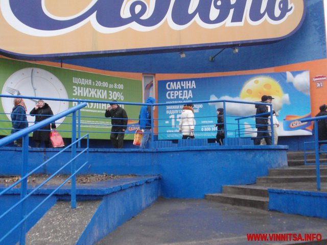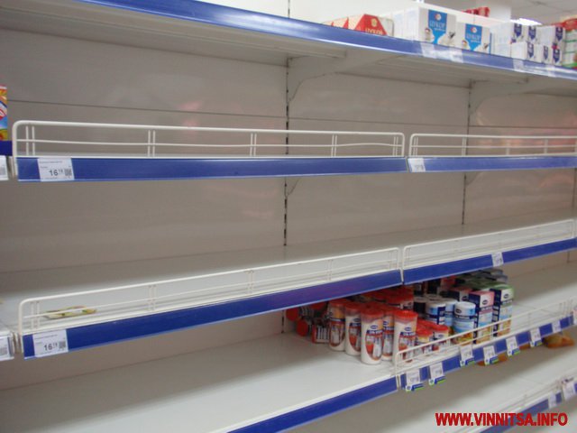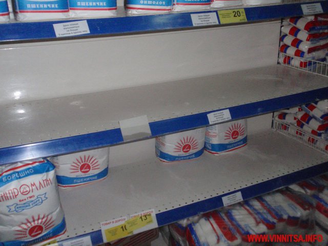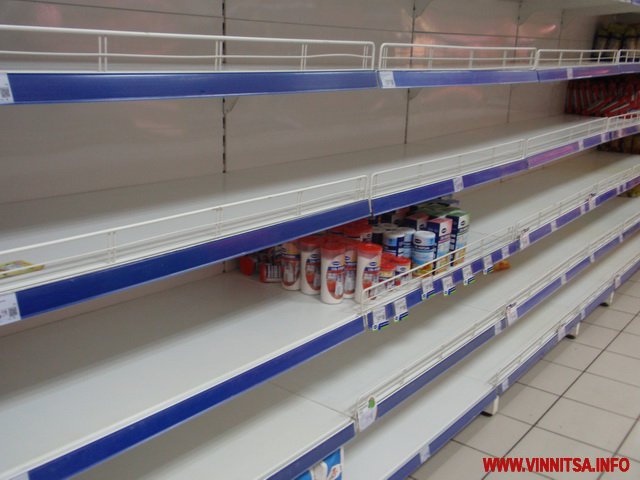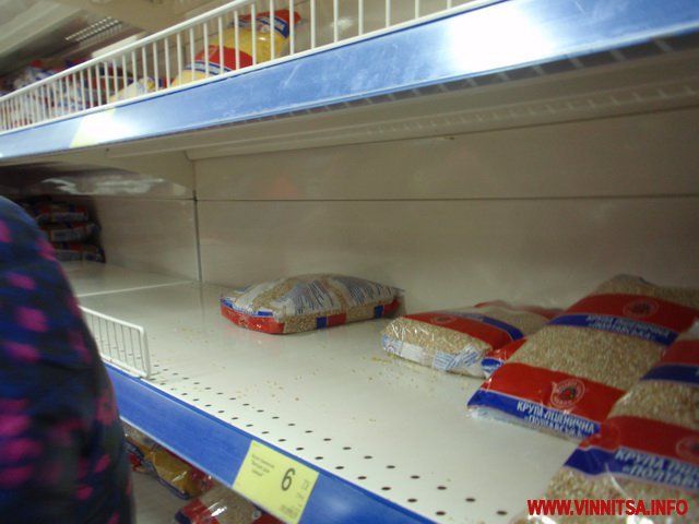 Сьогодні, 26 лютого у Вінницькому магазині «Сільпо», що біля залізничного вокзалу, полички з хлібом, крупами, цукром, мукою та олією повністю пусті. Є звичайно, макарони по 26 гривень за кілограм, хліб чорний круглий майже по 6 гривень, та оливкова олія по 54 гривні.