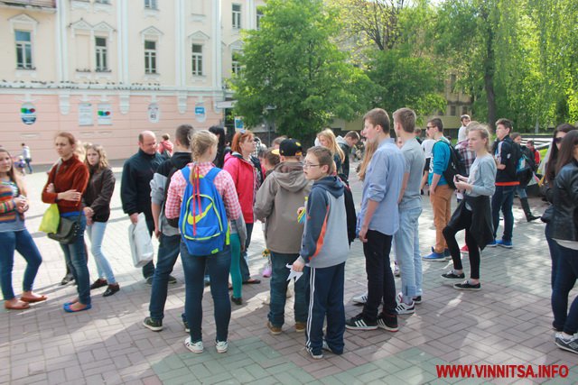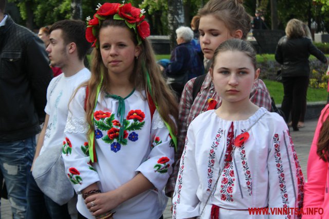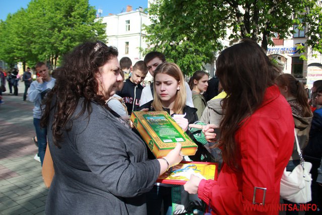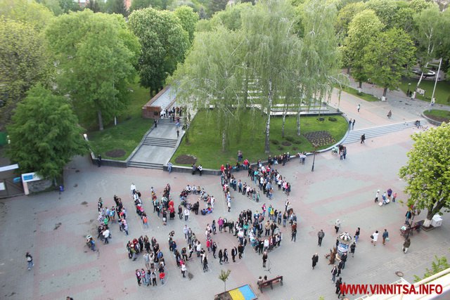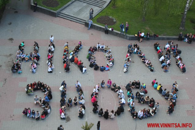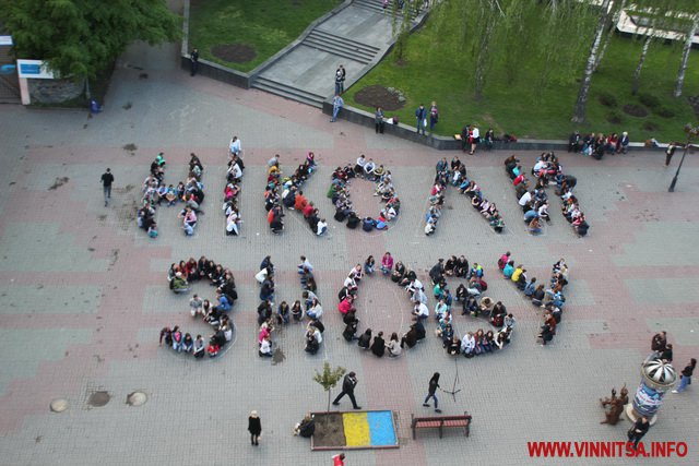 8 травня Європейська площа зібрали близько 250 вінничан, щоб провести патріотичний флешмоб. Студенти і просто перехожі стали на вже намальовані літери напису «Ніколи знову».