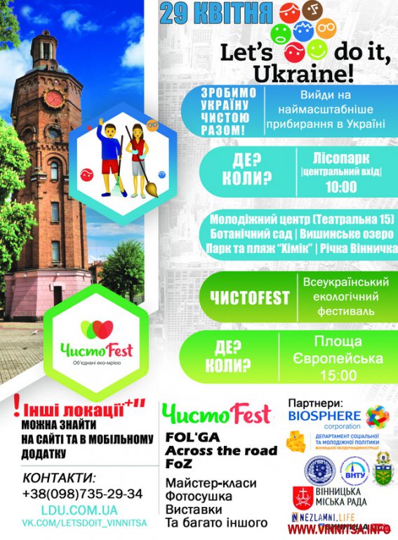 29 квітня о 10:00 годині у Вінницькій області відбудеться акція «Зробимо Україну чистою разом!».  В рамках акції заплановані заходи з прибирання прибудинкових, паркових та прибережних зон населених пунктів. Окрім прибирання, усіх охочих долучитись екологічного руху, запрошують нанаймасштабніший мистецько-екологічний фестиваль «ЧистоFest».
