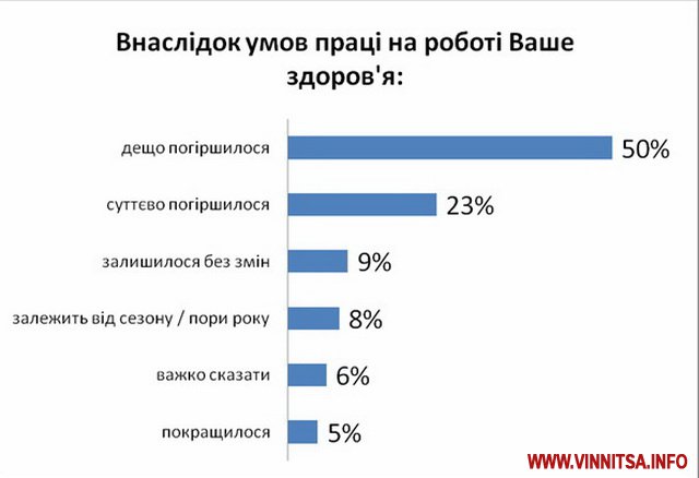 Умови праці негативно впливають на стан здоров'я працівників. Половина респондентів заявила, що в результаті роботи стан їхнього здоров'я дещо погіршився. Для чверті опитаних – погіршився суттєво. Лише 5% відзначили, що стали здоровішими завдяки роботі.