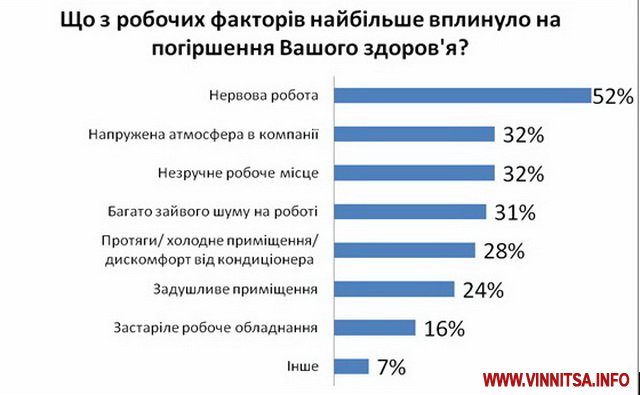 Найважливіший чинник, який вплинув на погіршення здоров'я, – нервова робота (50%). На другому місці напружена атмосфера в компанії, незручне робоче місце (крісло, стіл тощо), багато зайвого галасу на роботі (забагато людей в одному приміщенні) − майже третина респондентів назвали ці фактори. 28% заважають протяги / холодне приміщення / дискомфорт від кондиціонера, а 24% навпаки скаржаться на задуху в офісі. Багато працівників страждають від незручного графіка роботи: «постійно ненормований графік роботи, без відпусток», «графік роботи понад 10 годин на день», «робота в нічний час», «відрядження, відсутність здорового харчування», «дуже багато проектів і недостатньо співробітників».