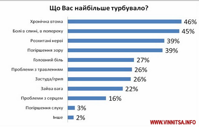 Половина офісних працівників звинувачує у цьому напружену і нервову роботу. Найпопулярніша проблема зі здоров'ям за останній рік – хронічна втома. 65% не скаржилися начальству про проблеми зі здоров'ям на роботі, оскільки найчастіше знають з досвіду, що це марно.