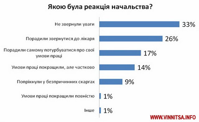 Офісні працівники не розраховують на розуміння начальства, коли справа доходить до поліпшення умов праці. Лише 35% респондентів, здоров'я яких погіршилося за останній рік, скаржилися начальству на умови роботи. Третина з них відзначили, що керівництво на їхні скарги не звернуло уваги. Начальство порадило або звернутися до лікаря (26%), або самому подбати про свої умови праці (17%). 9% начальників дорікнули підлеглим за безпричинні скарги. Роботодавець поліпшив умови праці після скарги підлеглого частково в 14% випадків, і лише в 1% випадків – повністю змінив облаштування робочого місця.