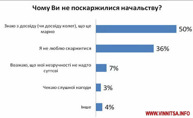 Половина з тих, хто не скаржилися начальству на незадовільні для стану здоров'я умови праці, не робили це тому, що знають з досвіду (або досвіду колег), що скаржитися марно. 36% просто не люблять скаржитися. 7% вважає, що їх незручності не дуже істотні. І 3% чекають слушної нагоди. Один респондент зазначив, що в компанії діє принцип: «Якщо щось не подобається, ти знаєш, де двері».