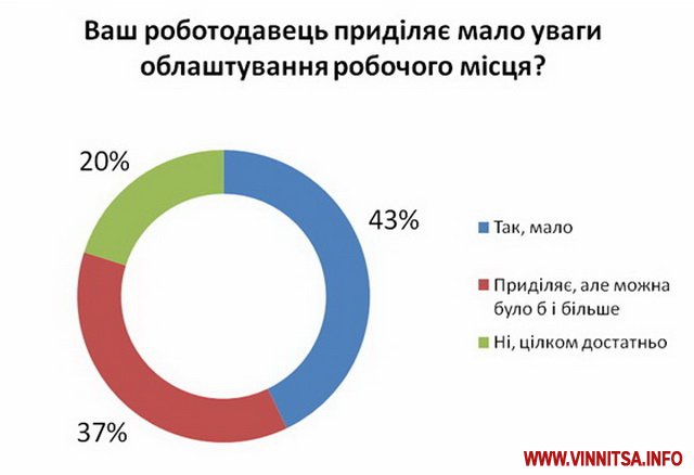 80% опитаних вважає, що роботодавець приділяє облаштуванню робочого місця мало (43%) або недостатньо (37%) уваги. Лише п'ята частина офісних працівників вважає, що роботодавець турбується про належні умови праці для працівників.