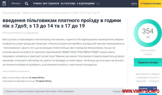 2 серпня петиція до Вінницької міської ради про введення пільговикам платного проїзду в години пік з 7до 9, з 13 до 14 та з 17 до 19 годин набрала 354 підписи, з 350 необхідних, її прийняли до розгляду. Відповідь на петицію повинні оприлюднити не пізніше 15 серпня.