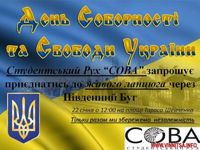 22 січня у Вінниці проведуть акцію «Живий ланцюг єднання». Захід присвячений Дню Соборності і Свободи України.