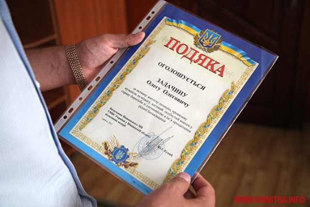 За допомогу правоохоронцям у затриманні грабіжника місцевої жительки, вінничанин Олег Задачин отримав подяку від керівника Вінницького міського відділу міліції Юрія Куцого.