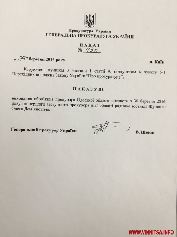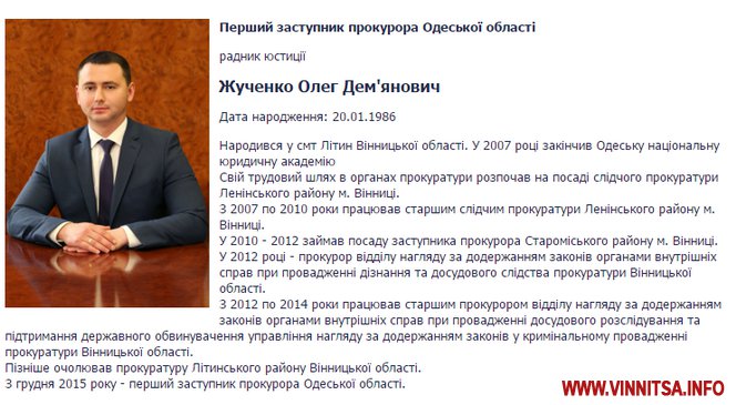 Таким чином, виконуючим обов’язки прокурора Одеської області став його перший заступник – Олег Жученко, який до призначення на посаду заступника прокурора Одеської області очолював прокуратуру Літинського району Вінницької області. .
