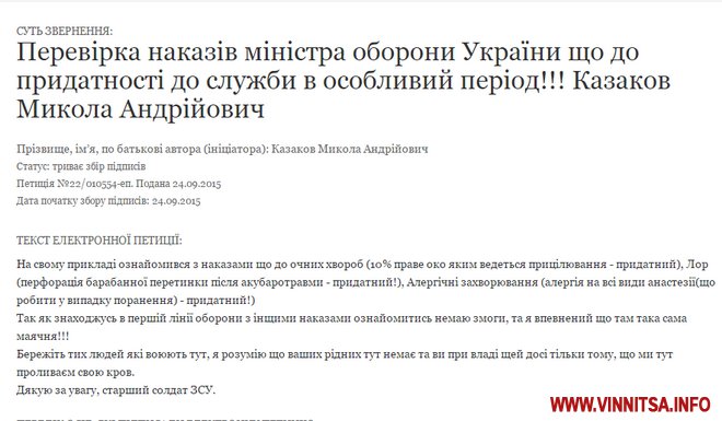 Казаков намагається хоч якось достукатися до керівництва ЗСУ. На сайті Президента він зареєстрував петицію, у якій просить детально перевіряти накази Міноборони щодо придатності для служби.