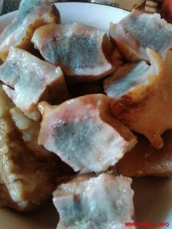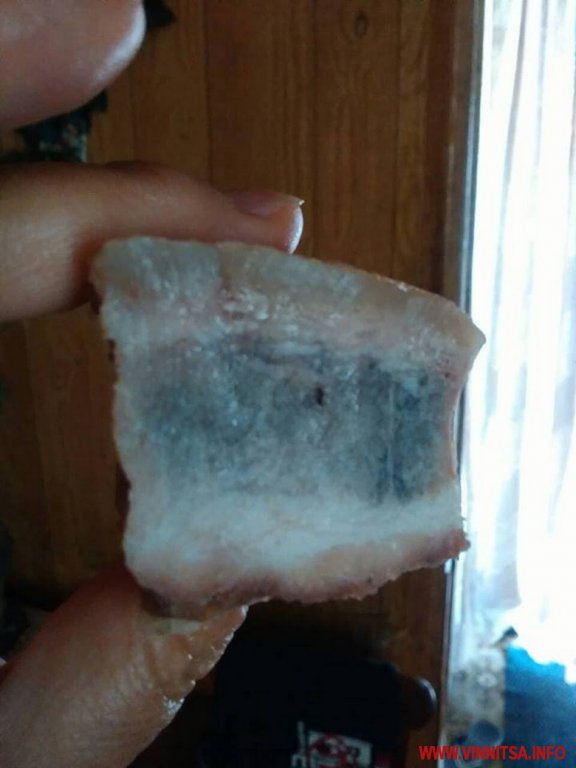В середині серпня вінничанка купила на базарі почеревину. Після того, як жінка його відварила, воно всередині почорніло. Фахівці кажуть, що сало з хімією.