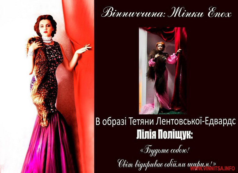 В образі Тетяни Лентовської-Едвардс - круїзний експерт, організатор проектів «Mrs. Vinnytsia», «Mrs. Ukraine-World» Лілія Поліщук.