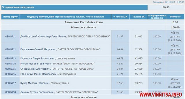 Так, переможцем на виборчому окрузі №11 став екс-губернатор Вінницької області Олександр Домбровський, набравши 51,37% (51043 голосів виборців).