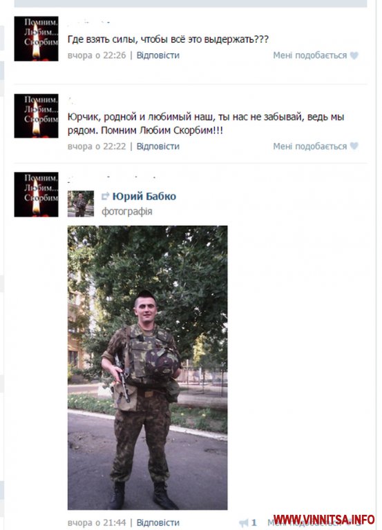 Вінниччина знову у скорботі. 14 липня у зоні антитерористичної операції загинув 26-річний старший солдат Юрій Бабко. Боєць родом із села Павлівка Калинівського району. Захисник з чотирма побратимами підірвалися на розтяжці під час розміновування території в районі Станиці Луганської.
