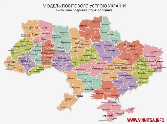 В експертній пропозиції Ігоря Коліушка передбачено створення 129 повітів на всій території України замість 490 районів, а також близько 1,5 тисяч громад замість 11,5 тисяч суб'єктів місцевого самоврядування у нинішньому статусі. З тих 129 повітів 10 припадає на окуповану частину Донбасу, а 8 — на Крим із Севастополем.