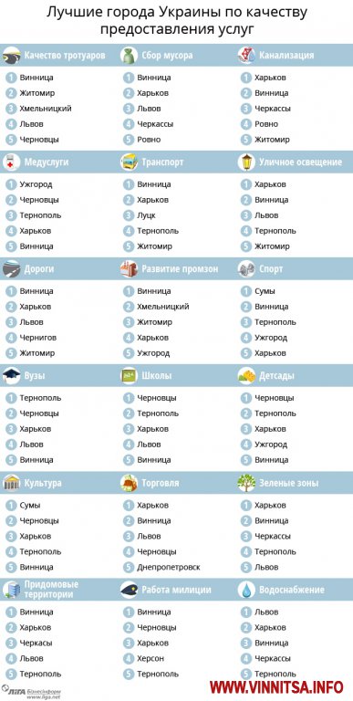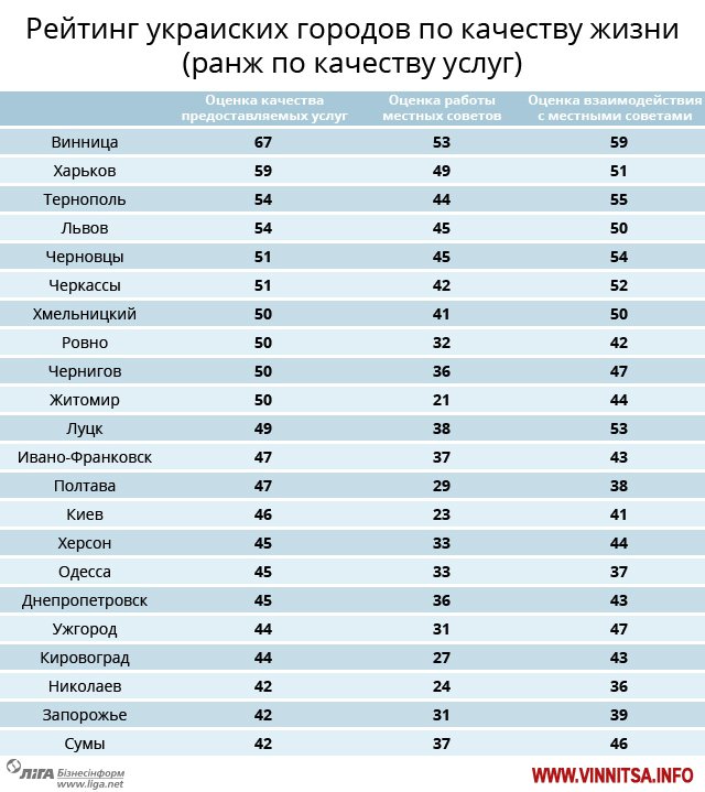 Винница входит в тройку лидеров по 13 показателям из 18 критериев, Харьков лидирует в 14 номинациях.