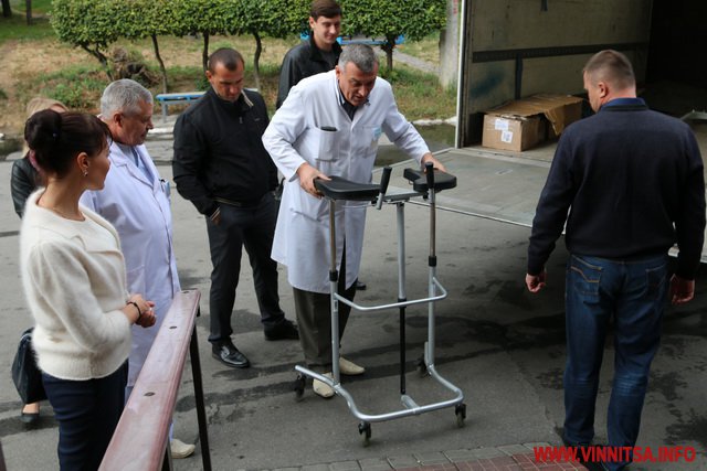 «Було зроблене статистичне дослідження і ми визначилися, що для наших лікарень є в першу чергу необхідне. Ми не кажемо зараз про спеціалізоване обладнання. Сьогодні ми передаємо ліфт, який потребувало відділення. Депутат міської ради Володимир Окаліта, та депутата обласної ради Андрій Ковальов знайшли Ірпінський фонд і разом з ними завезли сюди гуманітарний вантаж. Першу допомогу отримала Калинівська районна лікарня, ми туди завезли багатофункціональні ліжка, антипролежневі матраци. В ЦР «Гармонію» було завезено коляску. Окремим громадянам в рамках акції видавали коляски та ходунки. » - каже К. Поджаренко.