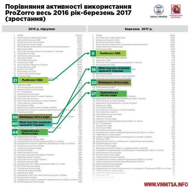 ГО «Платформа Громадський Контроль» по завершенню першого кварталу 2017 року провела порівняння відкритості органів влади в ProZorro. Дослідили, як змінювалася динаміка використання ProZorro в різних органах влади протягом перших 3-х місяців у співвідношенні з показниками 2016 року. Аналіз зроблений за першими 100 замовникам, які провели максимальну кількість торгів, серед них і Вінницька міська рада.