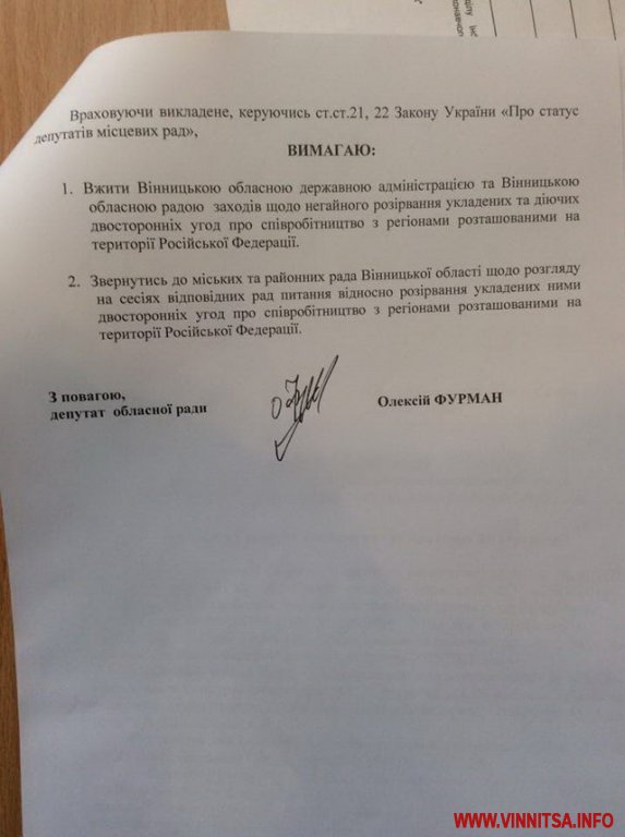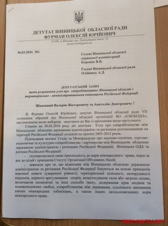 30 березня під час сесії Вінницької обласної ради підтримано депутатський запит Щодо розірвання угод про співробітництво Вінницької області з територіально-адміністративними одиницями Російської Федерації.