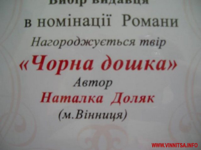 5 червня новий роман вінничанки, присвячений темі голодомору, став «Вибором видавця» на найпрестижнішому літературному конкурсі України. «Чорну дошку» Наталя Доляк називає своїм першим вистражданим рукописом.