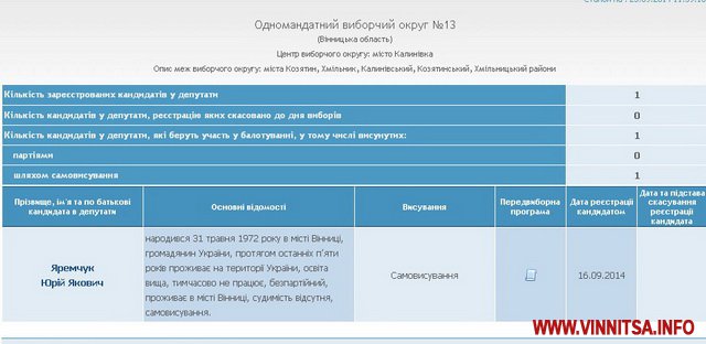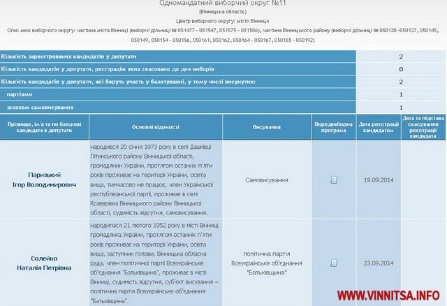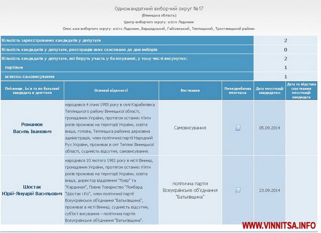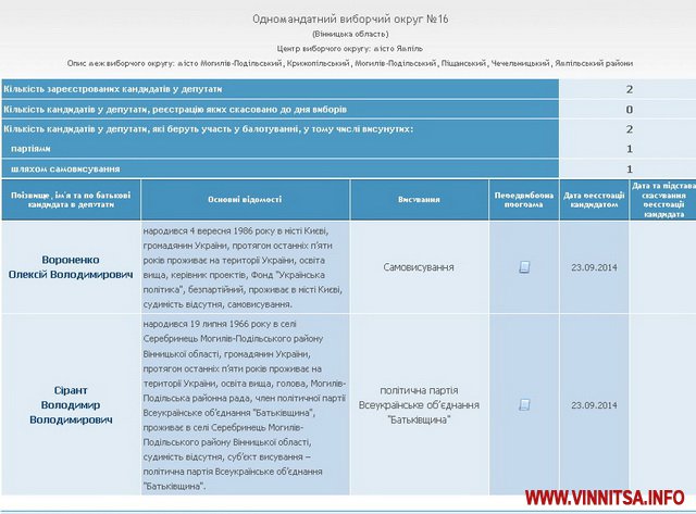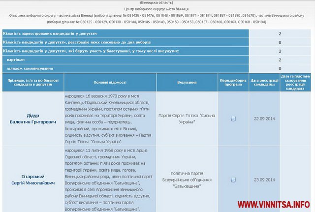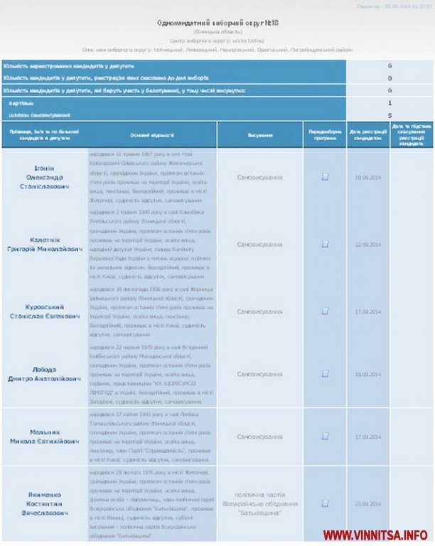 23 вересня в Центральній виборчій комісії кандидатами в народні депутати зареєструвались шестеро вінничан на ОВК №11, 12, 14, 15, 16, 17, 18, висунутих політичною партією Всеукраїнське об’єднання «Батьківщина».